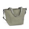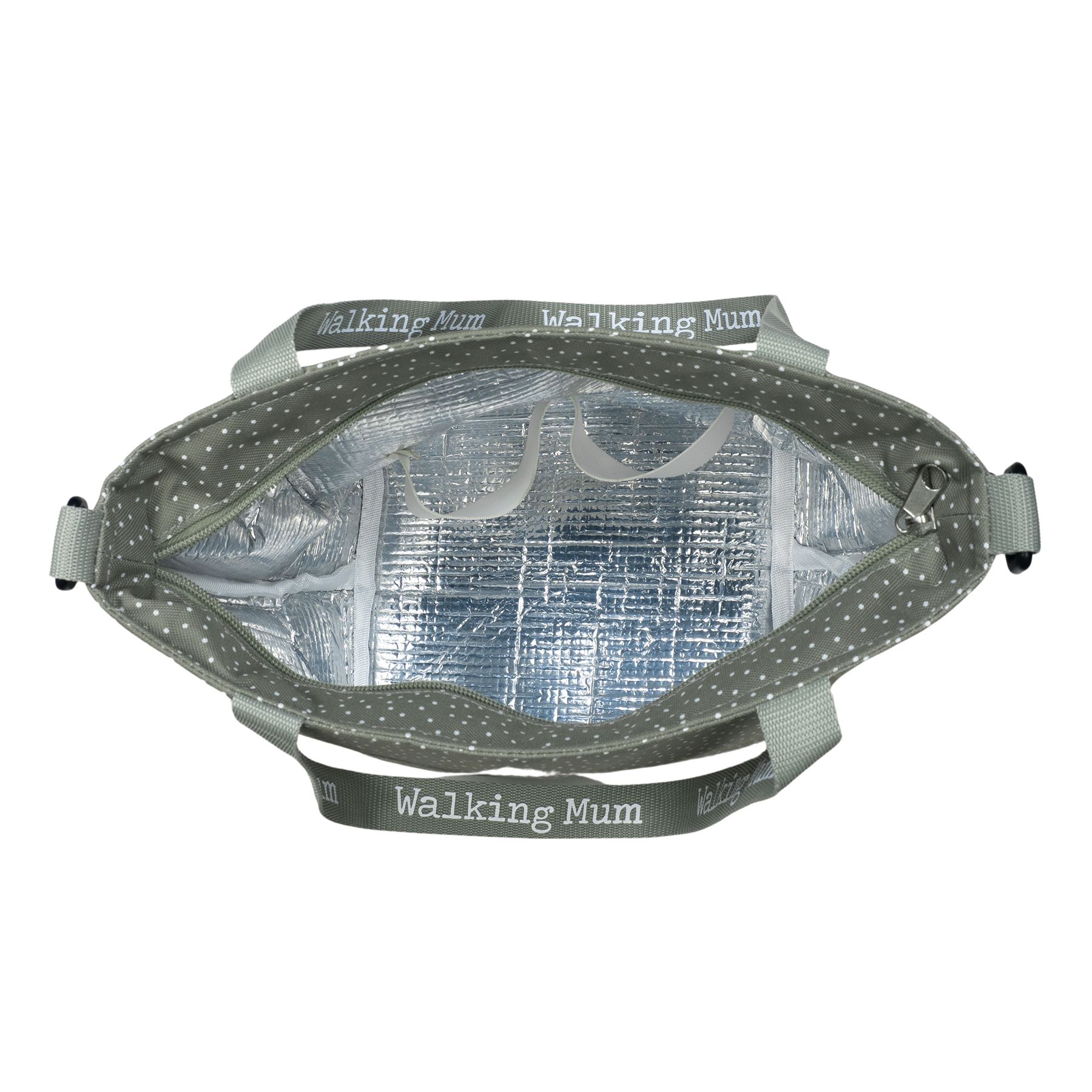 Bolsa térmica Poppy Musgo con topitos verde. Mantiene la temperatura durante 4 horas. También incorpora una asa larga para poder colgarla en el hombro y asa corta de mano.