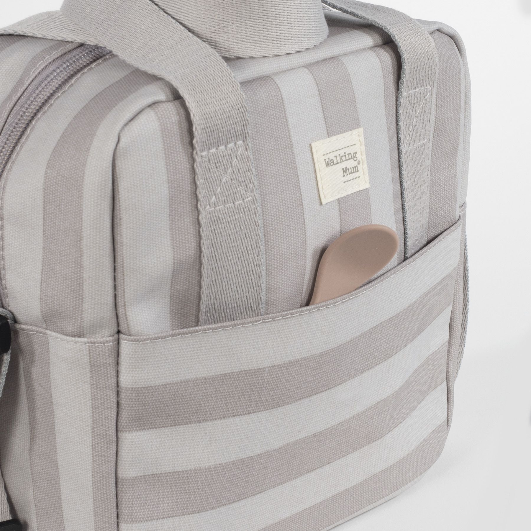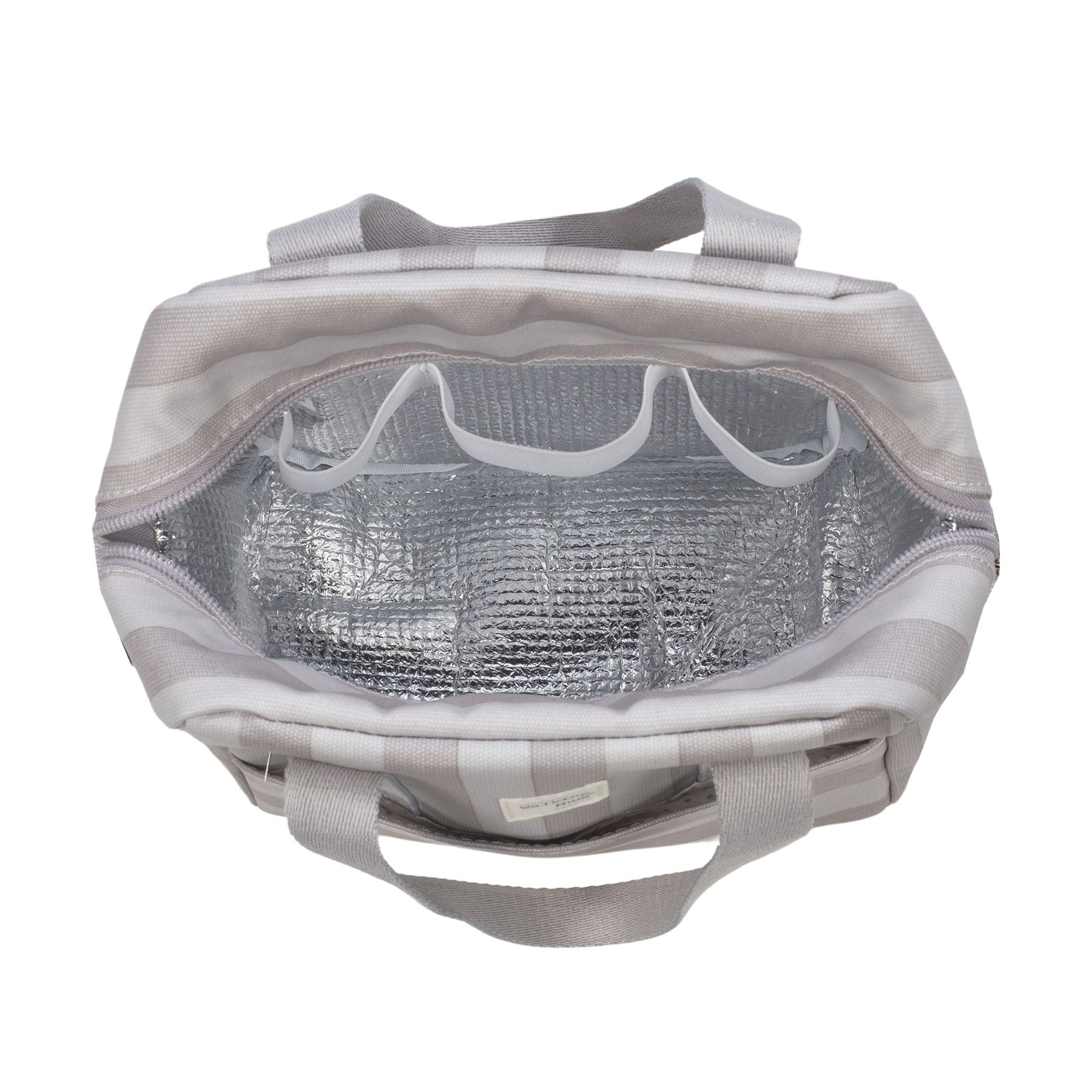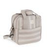 Bolsa térmica para biberones Sintra de rayas beige. Mantiene la temperatura durante 4 horas. También incorpora una asa larga para poder colgarla en el hombro y asa corta de mano.