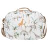 - Estampado: La bolsa presenta un diseño vibrante y colorido con figuras de animales de la sabana africana, como elefantes, jirafas y leones, junto a palmeras que aportan un toque tropical. Este estampado atractivo y alegre añade un estilo único a la bolsa.