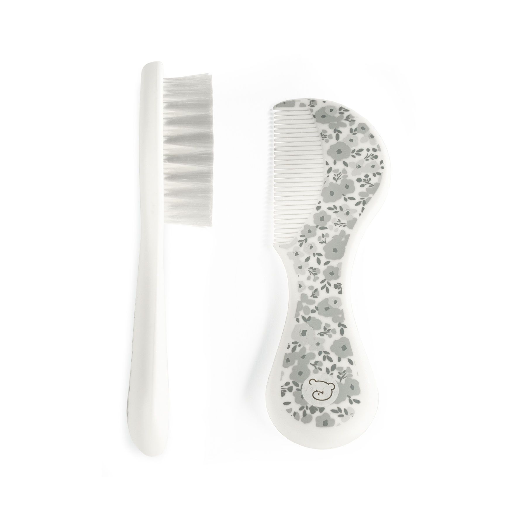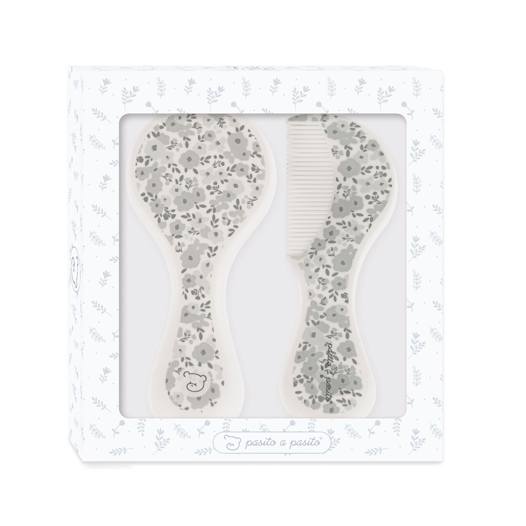 Set de cepillo y peine adecuado para el cuidado del bebé decorado con cuadro flores grises.
