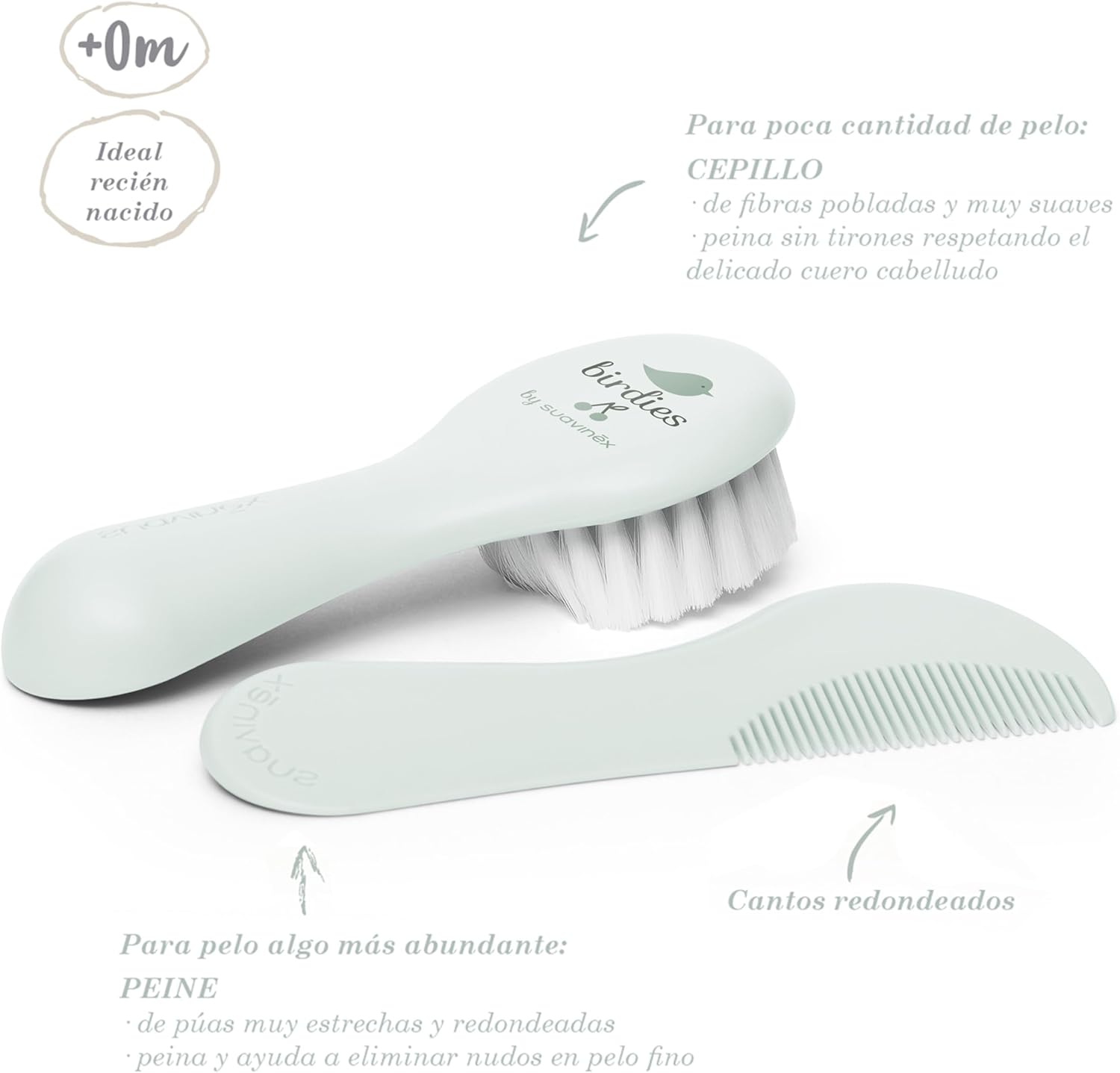 El Set Cepillo y Peine Bierdies Suavinex es un conjunto pensado para el cuidado delicado del cabello de tu bebé. Con un diseño suave y ergonómico, este set garantiza que el momento del baño o el cuidado personal sea más cómodo y placentero para tu pequeño.
