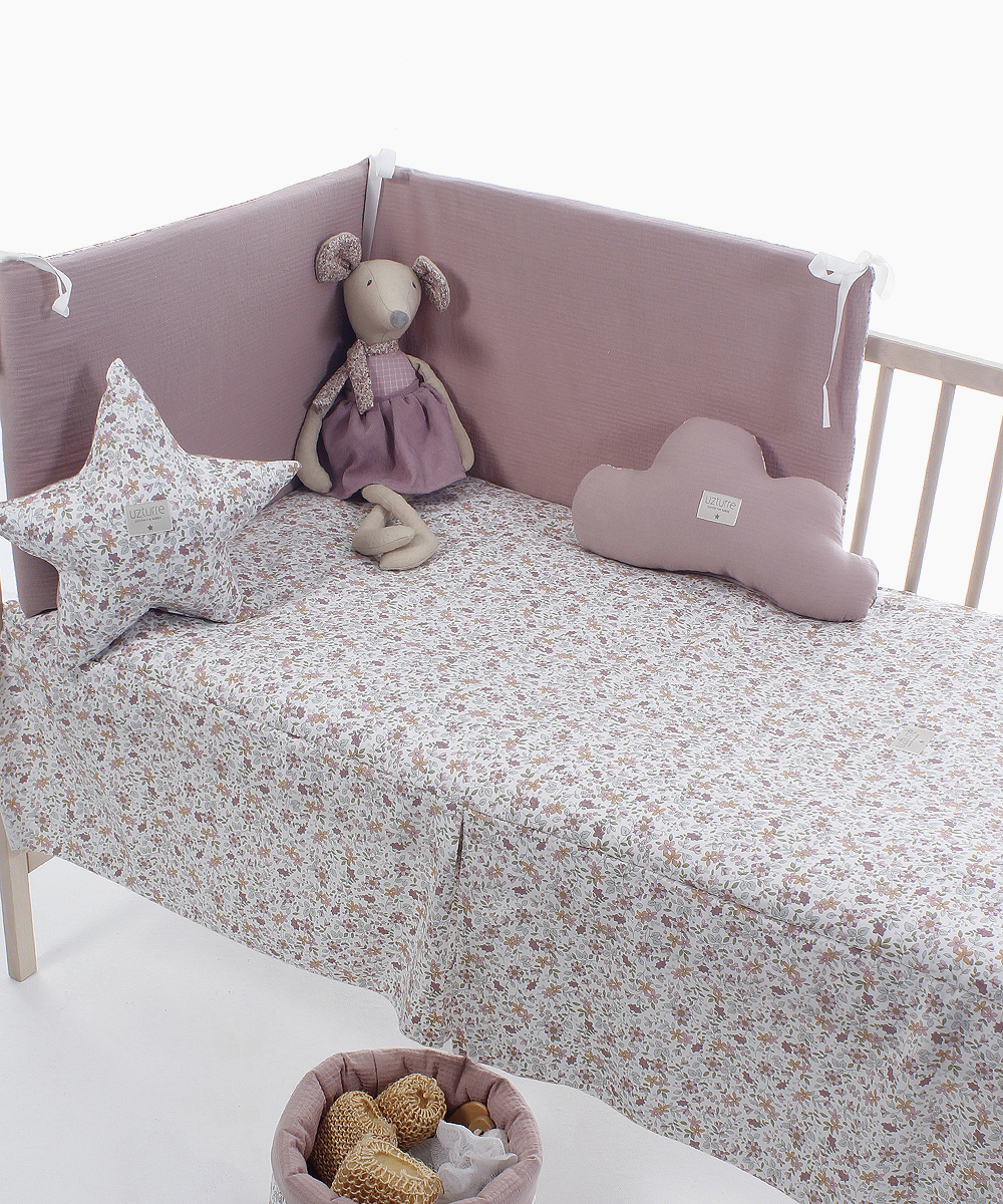 Pack de colcha y protector desenfundable con tejido lavable, relleno incluido y almohada. El protector es doble cara. El protector evita corrientes de aire y protege al bebé de golpes en los laterales de la cuna, impidiendo que manos o pies se introduzcan entre los barrotes. Se ajusta de forma segura y sencilla a la estructura. La colcha, coordinada con el protector, es versátil y práctica: en invierno, el relleno mantiene al bebé cálido; en verano, al retirarlo, la funda funciona como una colcha ligera. Una solución confortable y segura para su descanso.