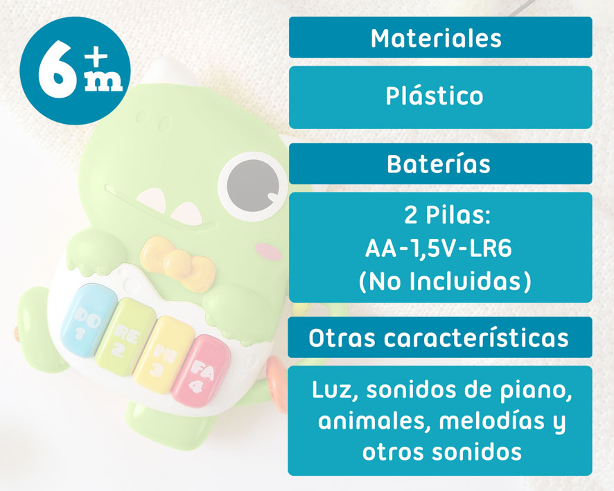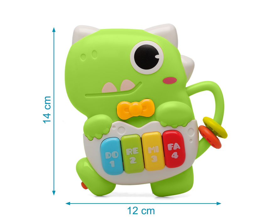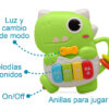 Este simpático dinosaurio verde, con su gran sonrisa y sus colores vivos, está pensado para convertirse en uno de los juguetes favoritos de tu peque. Basta con pulsar cualquiera de sus teclas para que empiece la diversión: notas de piano, sonidos de animales, melodías alegres y otros efectos que sorprenden y estimulan la curiosidad. Sus luces parpadean al ritmo de la música, haciendo que cada momento de juego sea una experiencia llena de color y energía.