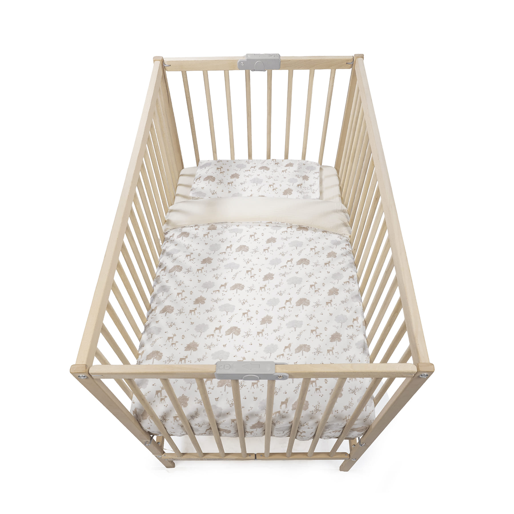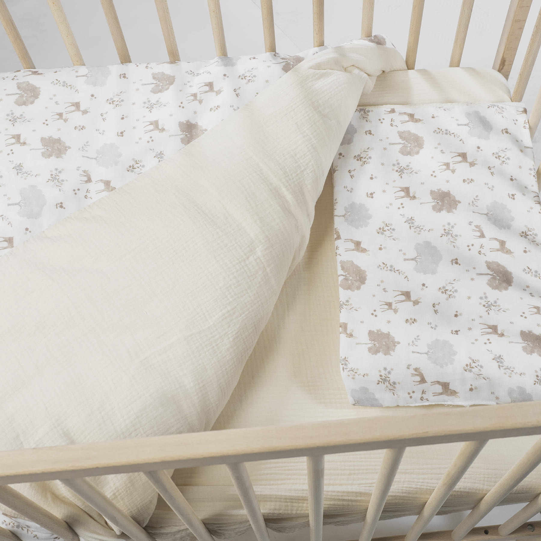 Set completo para cuna de 120×60 cm Nara de Pasito a Pasito: edredón, funda, sábana bajera y almohada. Prepara el nido perfecto para tu bebé con el set completo de ropa de cuna 120×60 cm de la adorable colección Nara de Pasito a Pasito. Este conjunto todo en uno ha sido cuidadosamente diseñado para ofrecer el máximo confort, seguridad y estilo en la habitación de tu pequeño. El set incluye: funda nordica y relleno, ambos confeccionados en 100% algodón de alta calidad, garantizan una suavidad inigualable y una transpirabilidad óptima. Sábana bajera ajustable de muselina 100% algodón, un elemento esencial para el descanso del bebé. Almohada con rejilla 3D transpirable, pensada para el soporte y la ventilación. La colección Nara de Pasito a Pasito se distingue por su diseño atemporal y unisex, que combina a la perfección con cualquier estilo de decoración infantil.