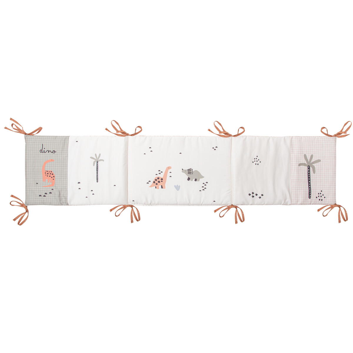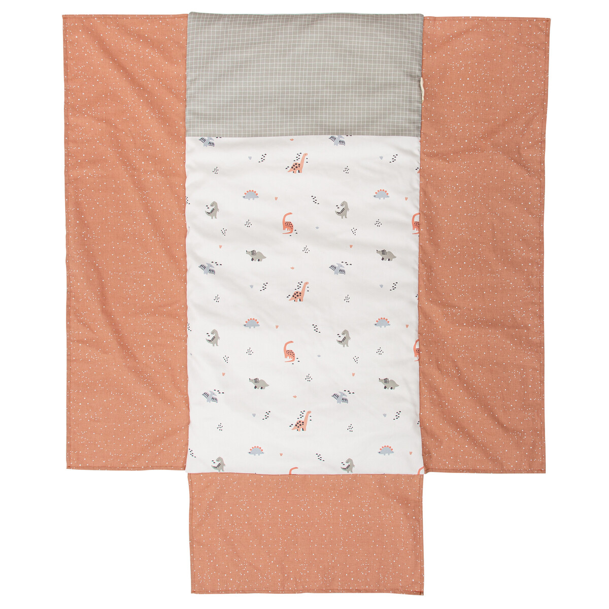 El edredón con protector para cuna de la colección Bronto de Bimbidreams es una opción ideal para vestir la cuna del bebé con confort, protección y un diseño divertido. Su estampado de dinosaurios en diferentes tonos aporta un toque alegre y original al dormitorio infantil, estimulando la imaginación desde los primeros meses.