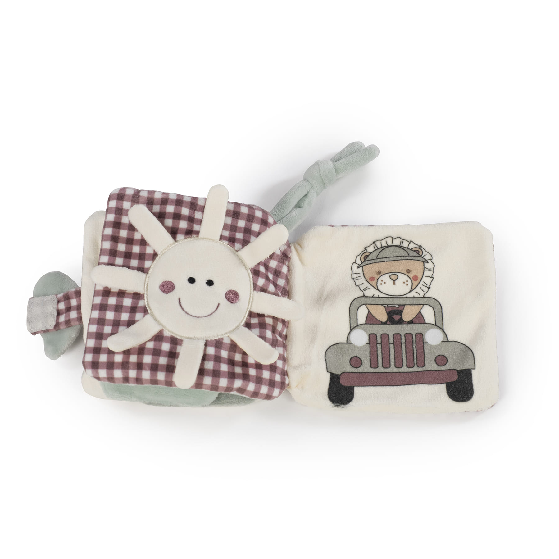 Este encantador libro de actividades suave de 12×12 cm, de la adorable colección Gala Cerise, está diseñado para estimular los sentidos de tu bebé y fomentar su desarrollo temprano. Confeccionado con velour, es increíblemente suave y perfecto para que las manitas exploren y agarren. Cada página presenta elementos atractivos que estimulan la curiosidad y las habilidades motoras finas. A tu bebé le encantará descubrir el simpático león asomándose, la luna arrugada con estrellas, el sol brillante y sonriente, y el león aventurero conduciendo un jeep.