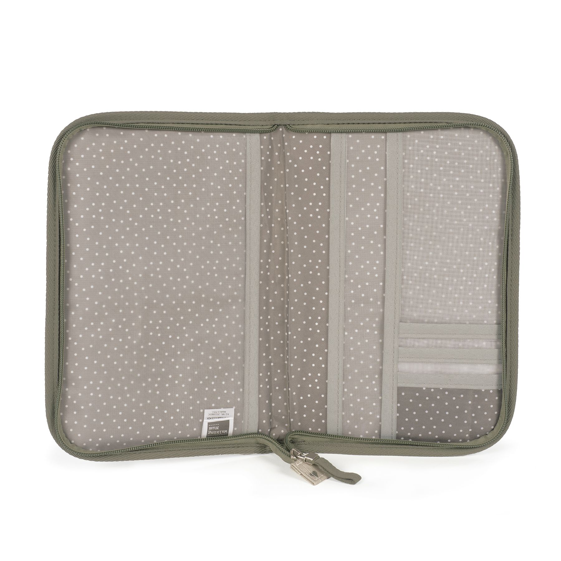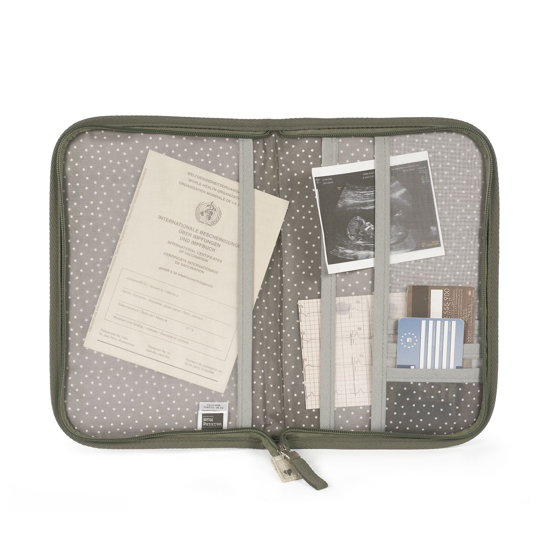 El libro de nacimiento Poppy Corazones Musgo es una funcional carpeta portadocumentos de diseño a juego con la bolsa de maternidad. Un complemento indispensable para llevar contigo a todas partes que te ayudará a tener ordenada toda la documentación y papeles médicos de tu bebé (vacunas, recetas, partida de nacimiento).