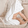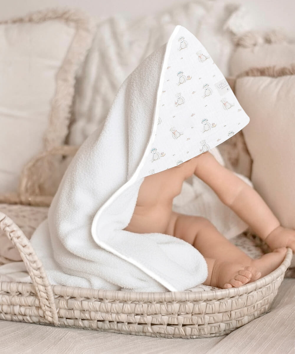 Descubre esta suave y elegante capa/toalla de baño XL, diseñada para secar a tu bebé con total comodidad gracias a su tejido altamente absorbente y resistente. Incorpora una preciosa capucha que aporta calidez y facilita el secado tras el baño. Presentada en un estuche deluxe ideal para regalo.