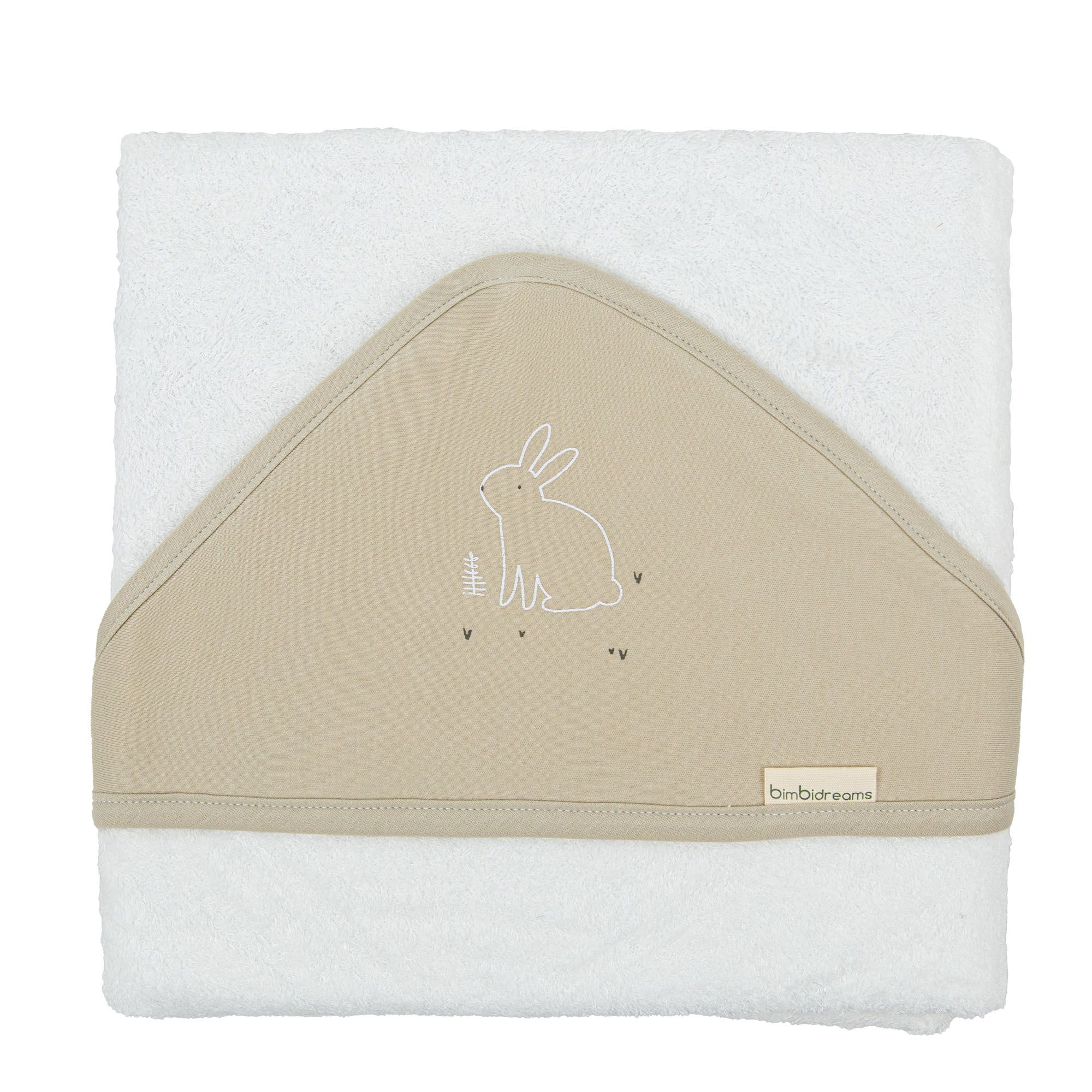 La capa de baño Bunny de Bimbidreams combina algodón blanco ultrasuave y absorbente con una capucha forrada en color a tono verde musgo. En la capucha aparece bordado un simpático conejito que aporta encanto y protege la cabeza del bebé tras el baño.