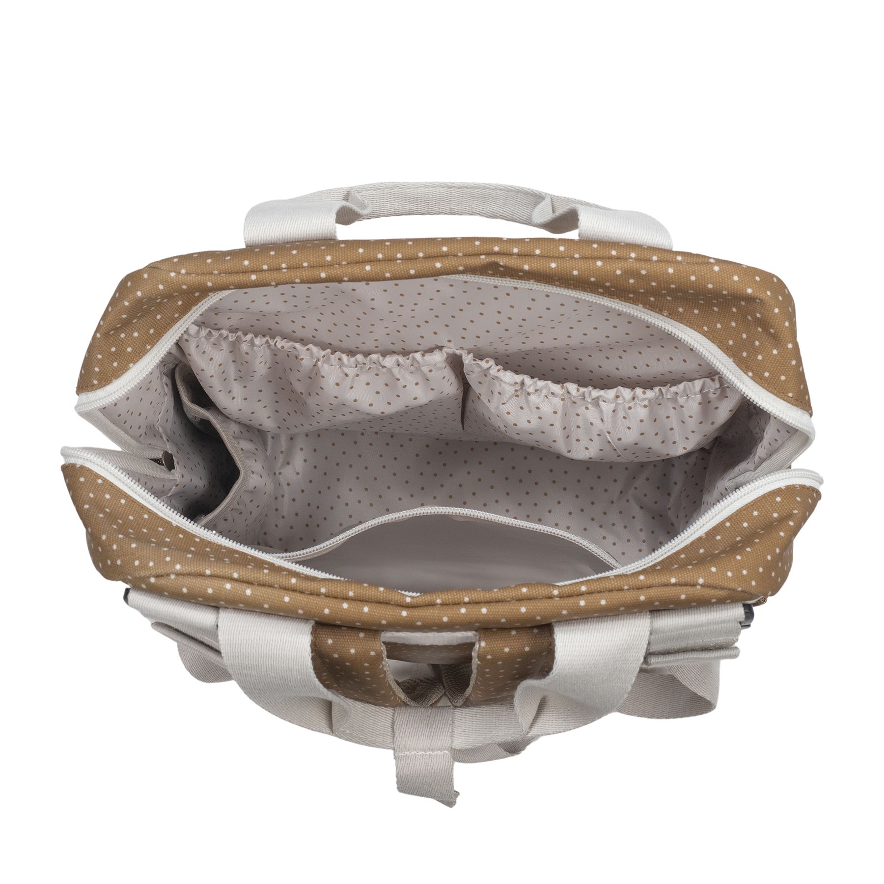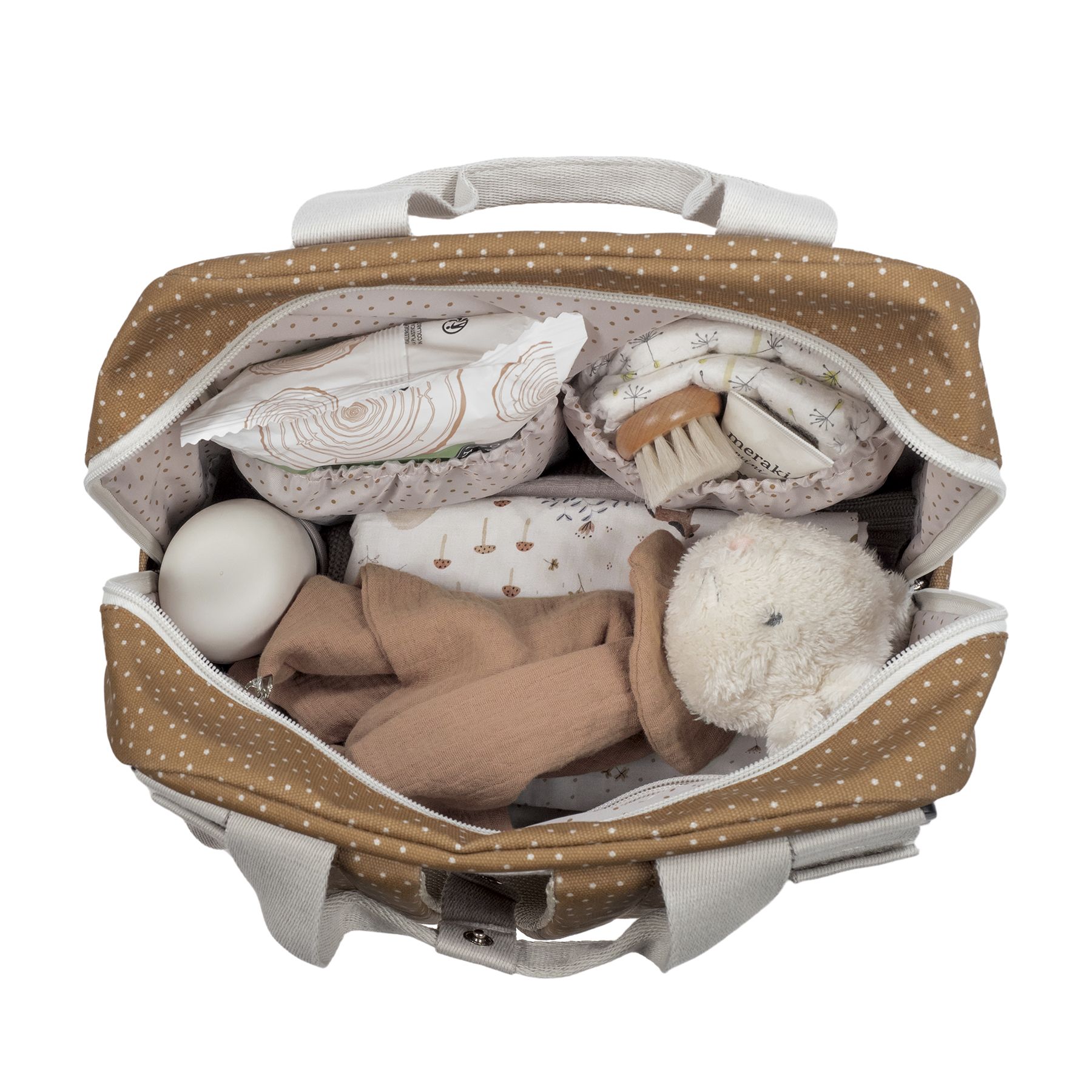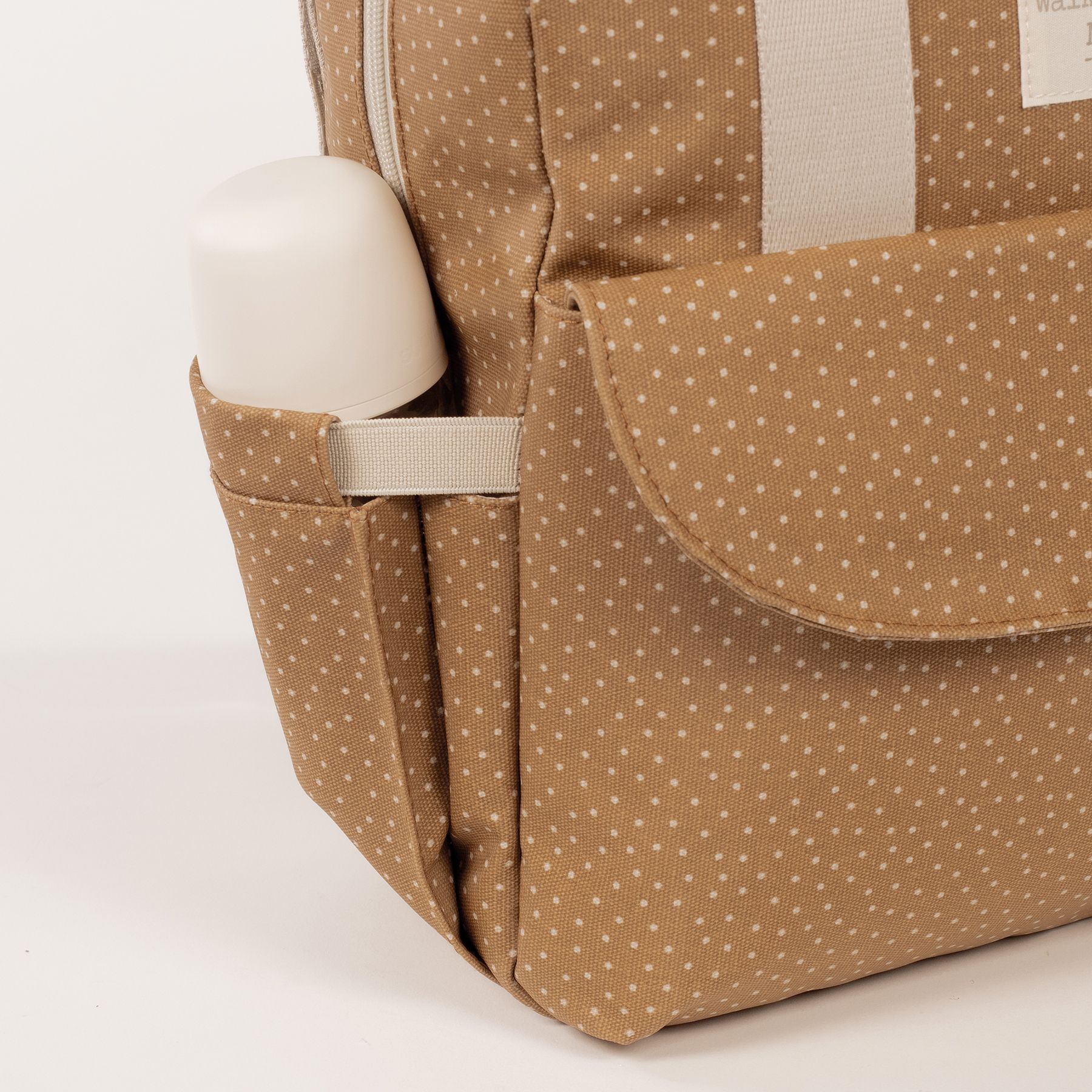 Una bolsa canastilla y mochila al mismo tiempo, muy moderna y urbana, ideal para llevar tus cosas y las de tu bebé, con mucho estilo, a todos sus paseos. La bolsa Poppy Canela de topitos para silla de paseo es un modelo multifunción muy ligero, resistente y de gran capacidad para llevar todo lo necesario en el paseo del bebe. Su esquema ofrece múltiples bolsillos exteriores e interiores para poder tener todo ordenado y a mano. Tiene bolsillos para guardar los biberones y mantenerlos seguros, elásticos para colocar cubiertos, para las toallitas húmedas, también tiene un funda para la botella de agua y otros más.