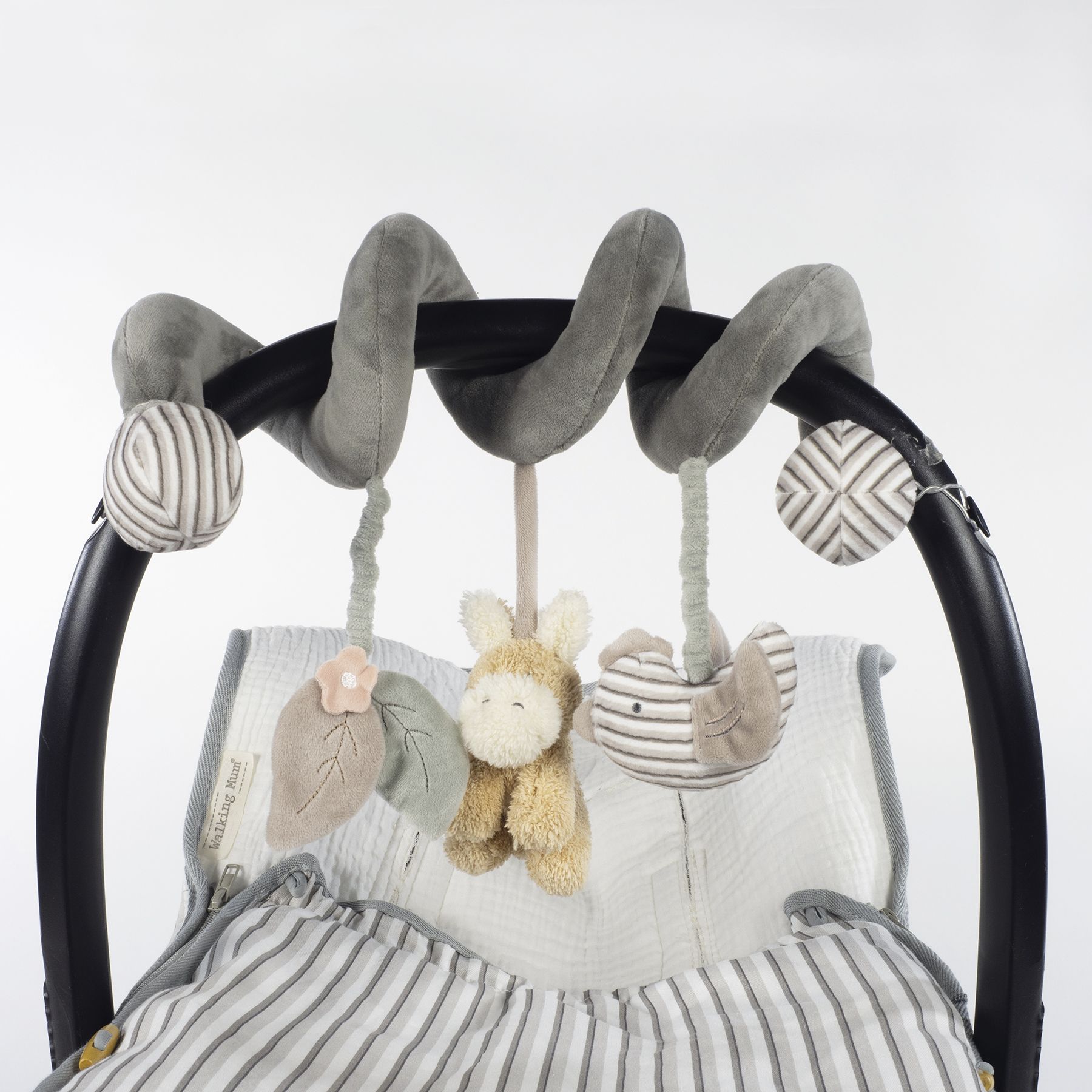 El juguete espiral con burrito de la colección Botton rayas de Walking Mum es el accesorio perfecto para estimular y entretener a tu bebé. Diseñado con materiales ultrasuaves como velour y peluche, este juguete es ideal para colgar en el cochecito o la silla del auto, proporcionando horas de diversión y aprendizaje. Fácil de colocar y se adapta a diferentes superficies. Incluye colgantes con diferentes texturas, formas y sonidos para el desarrollo del bebé. Adorable diseño con tonos neutros y elegantes. Sin piezas pequeñas ni elementos peligrosos. Este juguete no solo fomenta la exploración y el desarrollo sensorial, sino que también decora con ternura el espacio de tu bebé.
