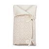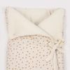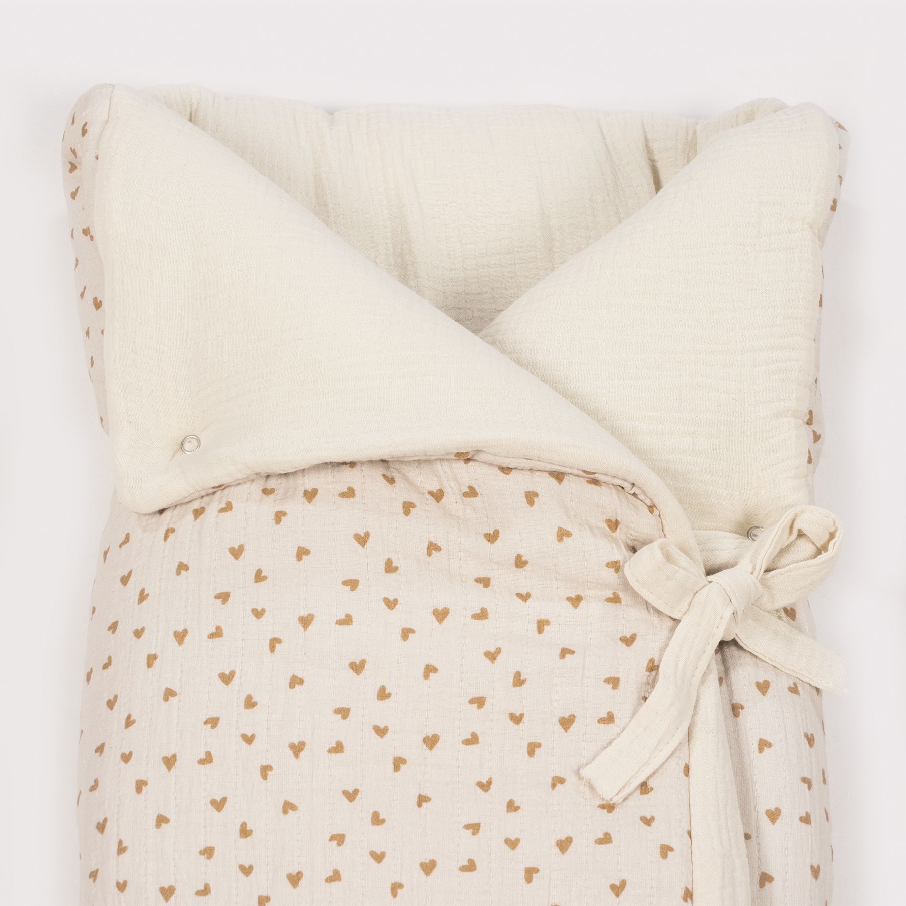 Saco arrullo o saco manta Poppy Corazones Canela. Está fabricado con un tejido exterior 100% algodón reciclado y una suave muselina en el interior 100% algodón. Ideal para los primeros días del bebé. Es perfecto para los primeros paseos en el capazo. Se convierte en una manta para la cuna. Practico cierre tipo sobre con velcros y cierre con cremallera en la parte inferior en los pies para que el bebé esté abrigado.