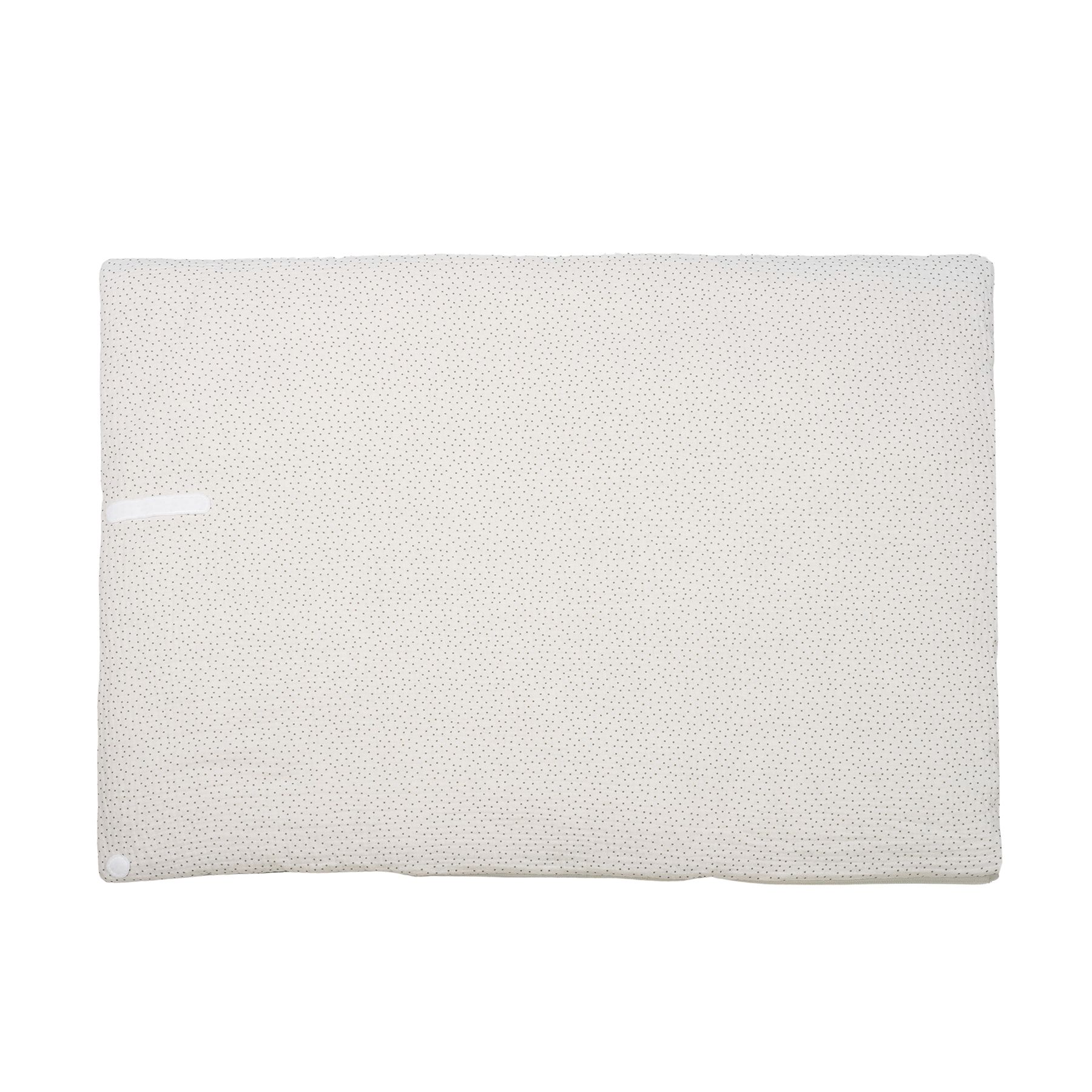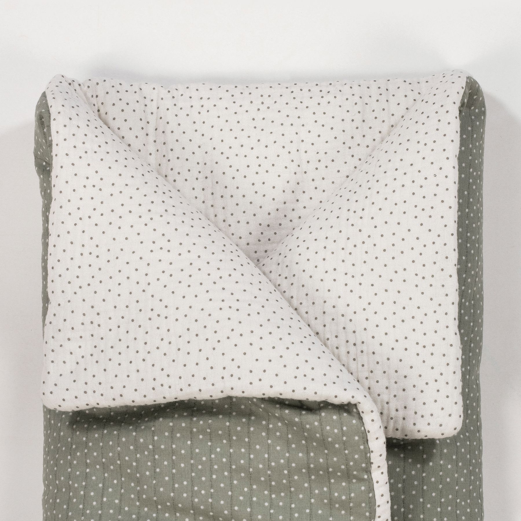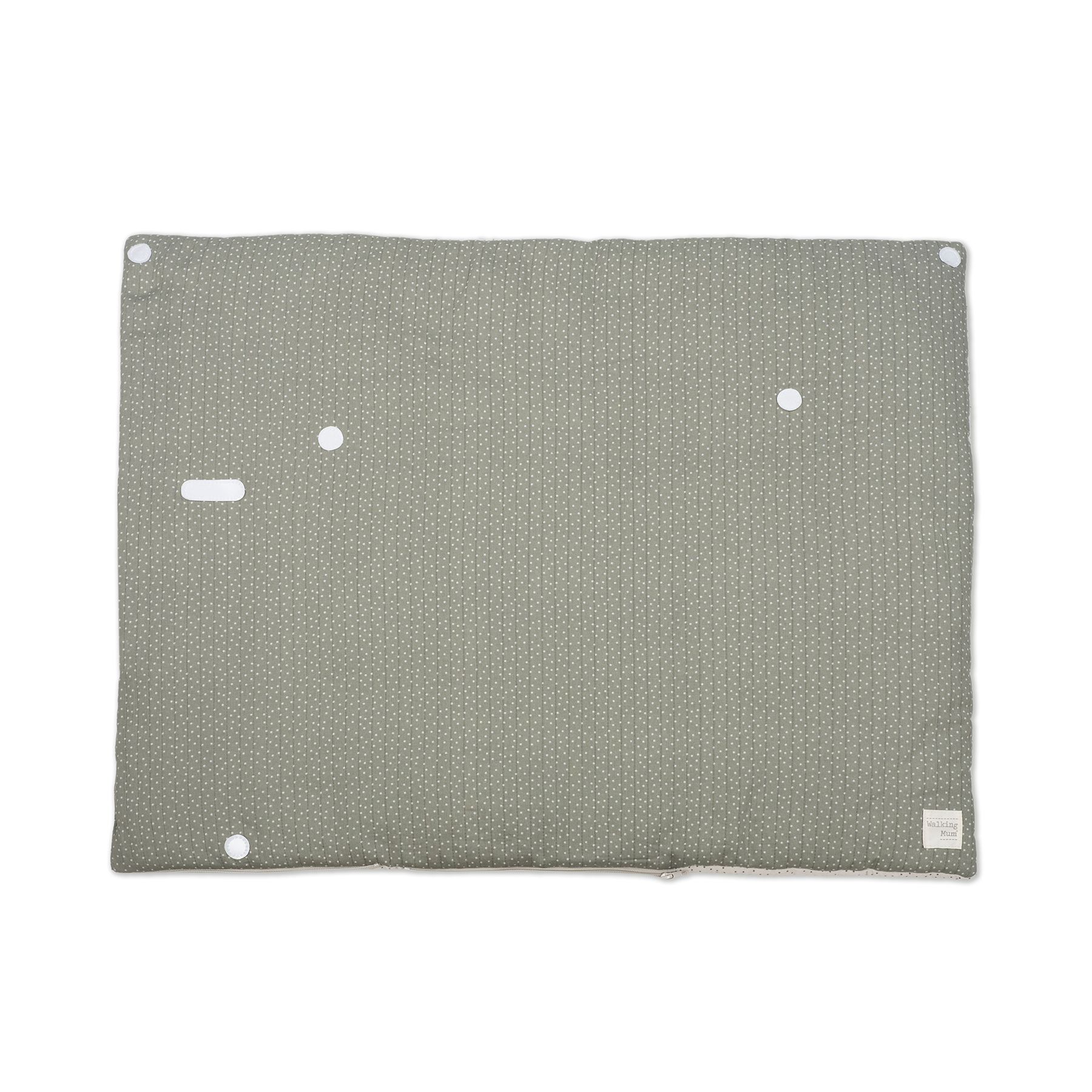 Saco arrullo o saco manta Poppy Topitos Musgo de topitos. Está fabricado con un tejido exterior 100% algodón reciclado y una suave muselina en el interior 100% algodón. Ideal para los primeros días del bebé. Es perfecto para los primeros paseos en el capazo. Se convierte en una manta para la cuna. Practico cierre tipo sobre con velcros y cierre con cremallera en la parte inferior en los pies para que el bebé esté abrigado.