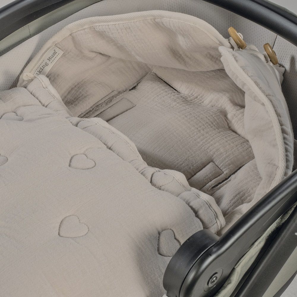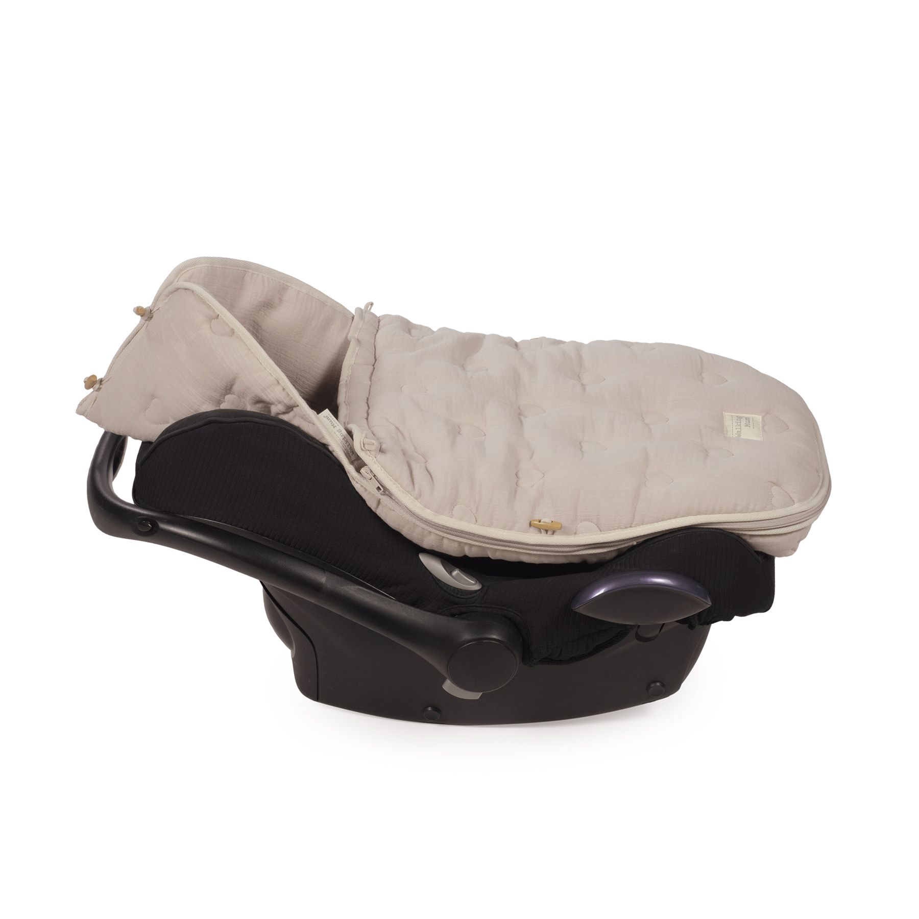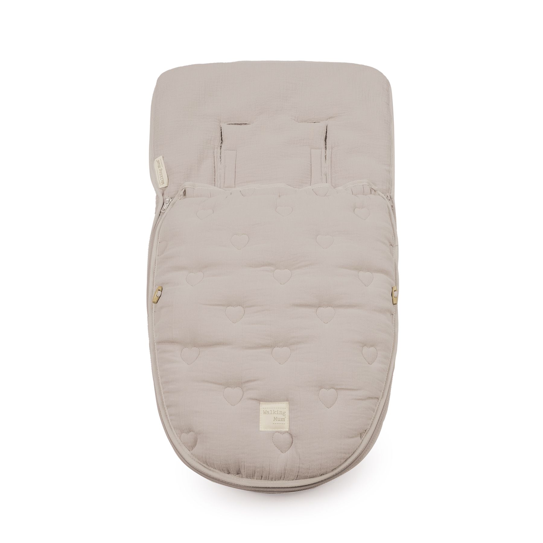Funda con saco Sintra beige con corazones bordados. Está fabricado con una suave muselina en el interior 100% algodón. Es ideal para cuco y portabebé. Dispone de varias aperturas (ojales) y ajustes para adaptarla a la mayoría de los Portabebés. Con este saco tu bebé estará cómodo durante los meses de primavera y de otoño. Trasera con material anti-sudoración que evita la sudoración excesiva del bebe y protege la silla haciendo el paseo más confortable. Puedes moverlo del carro a la cuna sin incomodarlo ni perturbar sus dulces sueños. Relleno extraíble.
