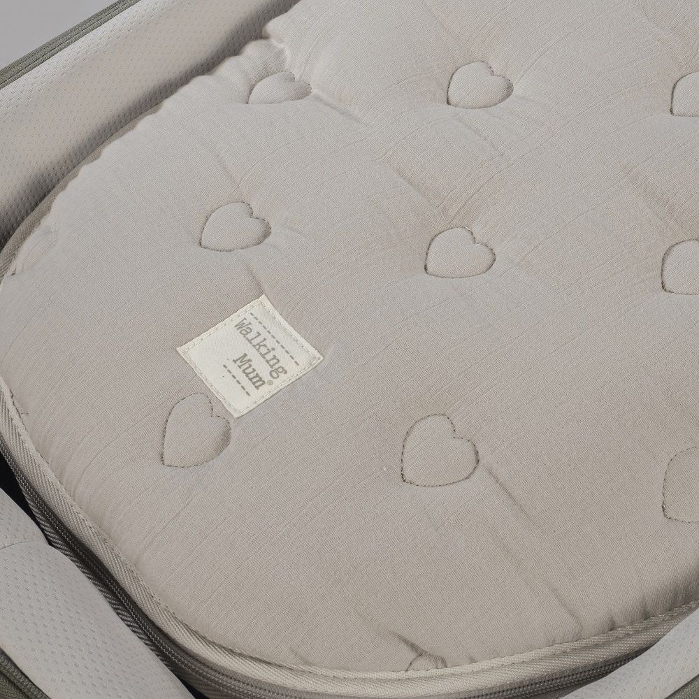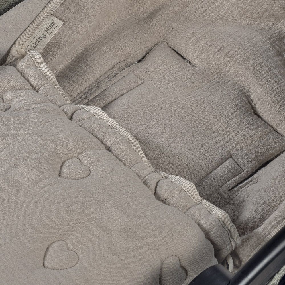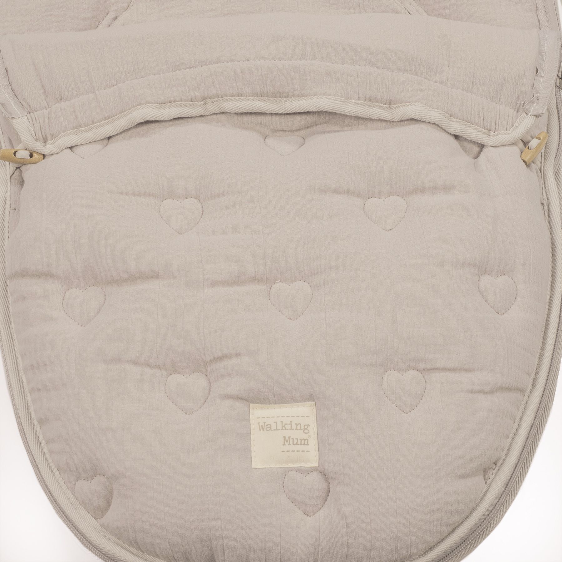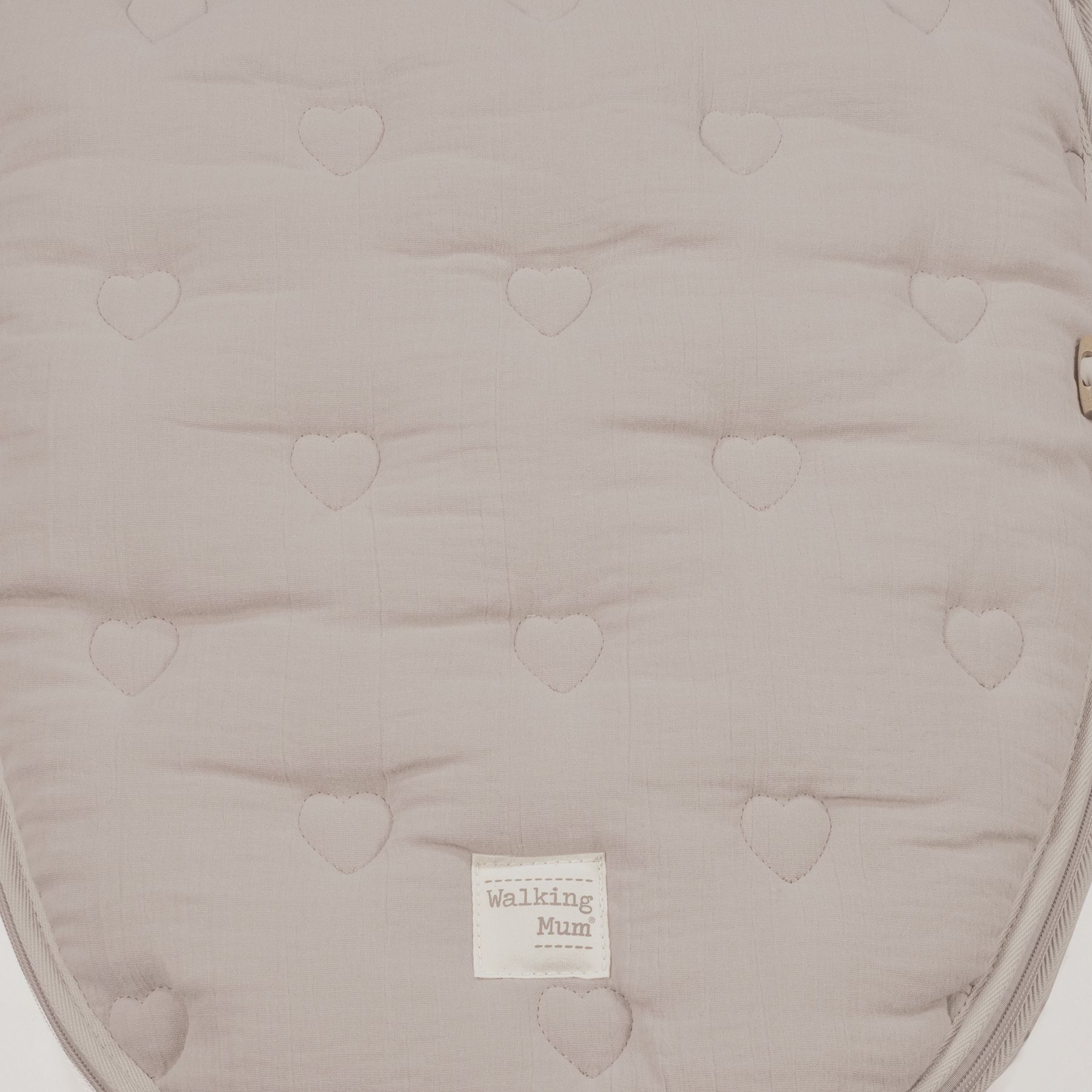 Funda con saco Sintra beige con corazones bordados. Está fabricado con una suave muselina en el interior 100% algodón. Es ideal para cuco y portabebé. Dispone de varias aperturas (ojales) y ajustes para adaptarla a la mayoría de los Portabebés. Con este saco tu bebé estará cómodo durante los meses de primavera y de otoño. Trasera con material anti-sudoración que evita la sudoración excesiva del bebe y protege la silla haciendo el paseo más confortable. Puedes moverlo del carro a la cuna sin incomodarlo ni perturbar sus dulces sueños. Relleno extraíble.