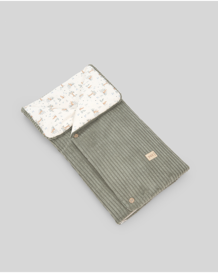 Encantador y funcional, este saco nana combina el estilo clásico con la ternura infantil que define a Paz Rodríguez. Confeccionado en tejido exterior de pana ancha, ofrece una textura cálida y elegante, mientras que su interior estampado con adorables conejos aporta un toque dulce y acogedor.