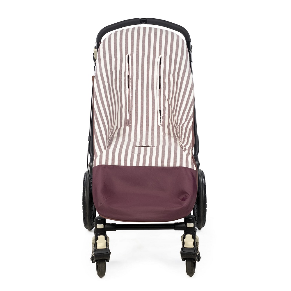 Funda Cherry Rayas de Pasito a pasito en tejido de algodón 100% muy suave ideal para cubrir la silla de paseo provista de saco. Está diseñado en el respaldar con una capa de tejido en material transpirable que aísla la humedad y evita la sudoración excesiva del bebe haciendo el paseo más confortable. Relleno de fibra hueca extraíble. Reposapiés de poliéster para facilitar la limpieza.