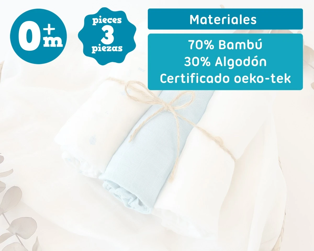 Set 3 Muselinas Bambú Azul Petit Moments Kiokids