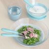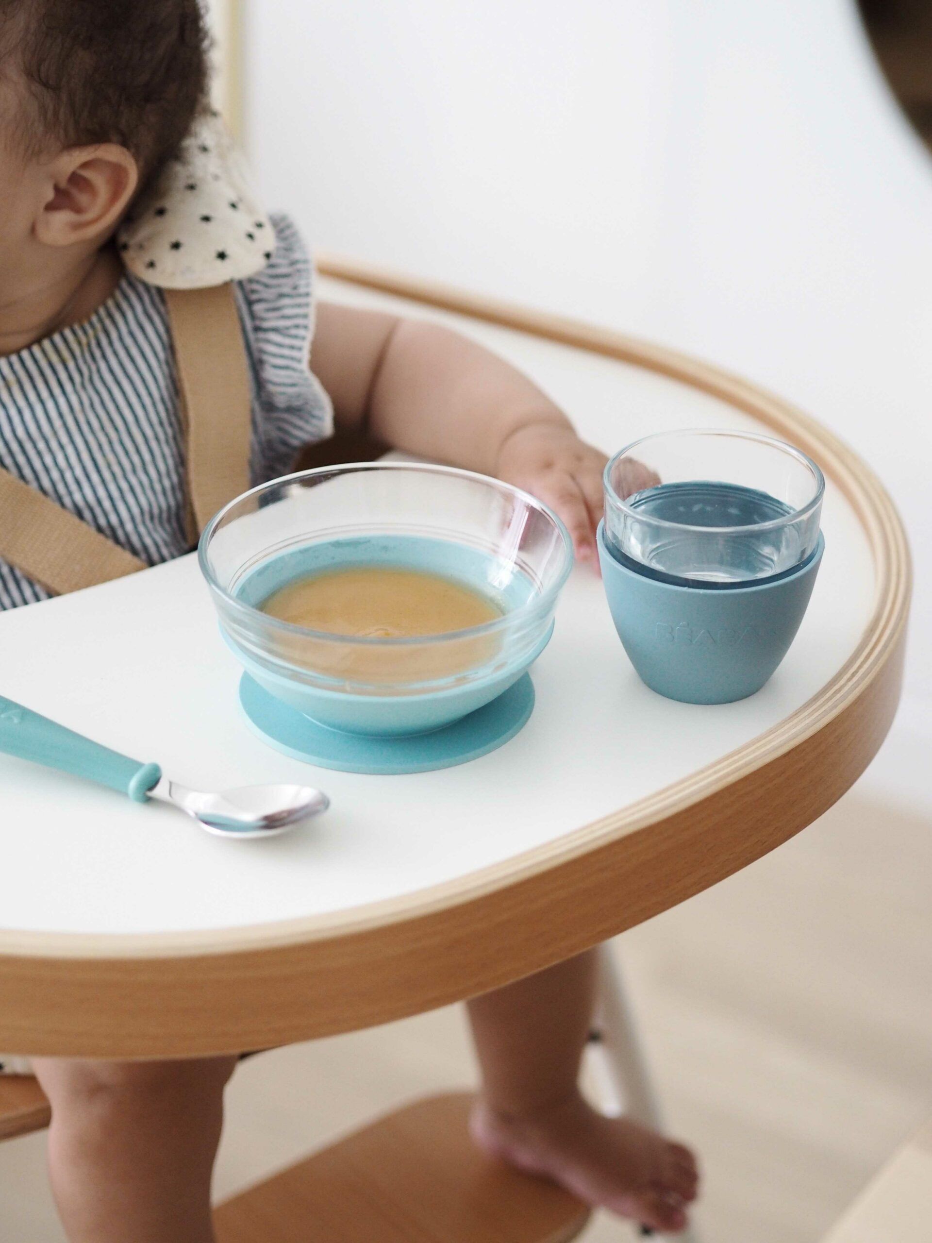 Incluye plato, bol y vaso de vidrio templado, cada uno con una base de material blando para mayor comodidad y seguridad durante las comidas. El vidrio templado es hasta 2,5 veces más resistente que el vidrio convencional, soporta golpes térmicos y mecánicos, y en caso de rotura se fragmenta en pequeños trozos no afilados para mayor seguridad.